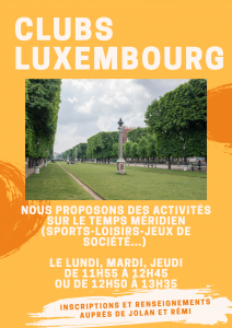 Pendant la pause méridienne et certains soirs de semaine, après la classe, des clubs et des sorties en au Luxembourg sont animés sous la responsabilité de la Vie scolaire : échecs, jeux de société, ping-pong etc. Encadrés par un assistant d'éducation, les élèves qui le souhaitent peuvent se réunir au foyer, accompagnés par un assistant d'éducation.