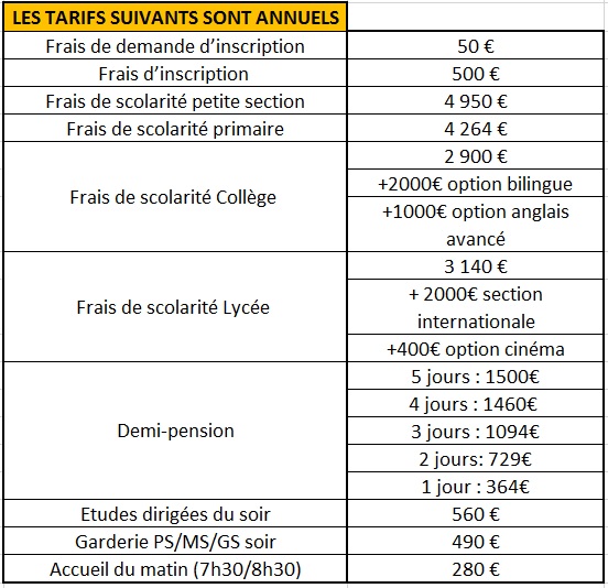 - Les frais de scolarité incluent toutes les sorties pédagogiques (et non les voyages), ainsi qu’une participation à l’aide aux familles. Le coût de location de la tablette obligatoire au collège est de 150€ par an en supplément.